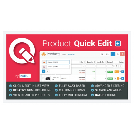 Product Quick Edit Plus enables you to quickly edit the values in place without having to leave the list view and open the conventional item edit page, so you can save a lot of time. You can also batch edit multiple products at once! This is ideal for shops with lots of products and big turnover where prices, quantities, etc often need to be changed.